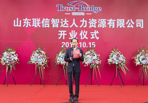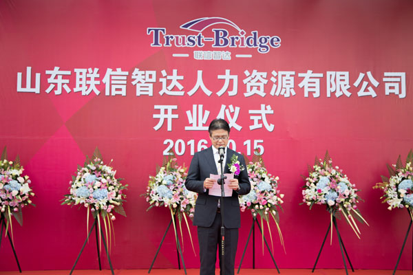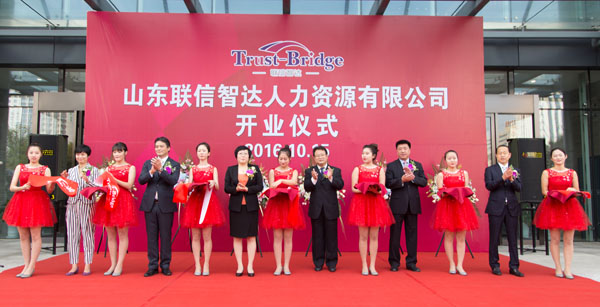 2016年10月15日上午8:30,由威海聯(lián)橋集團(tuán)與日本株式會社Trust-Tech共同出資成立的山東省首家中外合資人力資源公司—山東聯(lián)信智達(dá)人力資源有限公司開業(yè)儀式隆重舉行。人社部勞動爭議研究室主任李天國、威海市人社局局長王子明、威海市商務(wù)局副局長劉秀景,高區(qū)黨工委副書記、管委常務(wù)副主任喬軍,聯(lián)橋集團(tuán)董事長慕镕鍵、日本株式會社Trust-Tech社長西田穰等領(lǐng)導(dǎo)以及聯(lián)橋集團(tuán)員工、事業(yè)合作伙伴、媒體記者等共計200余人參加了開業(yè)儀式。山東聯(lián)信智達(dá)人力資源有限公司總經(jīng)理梁瀟尹主持開業(yè)儀式。