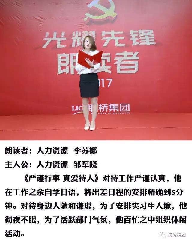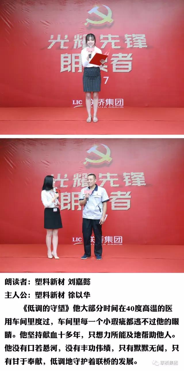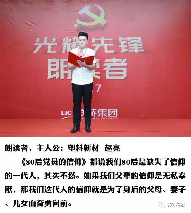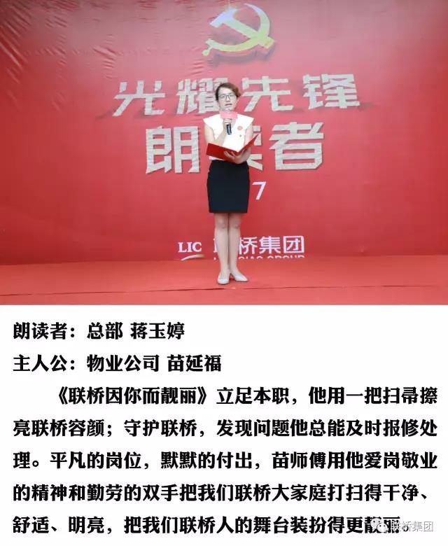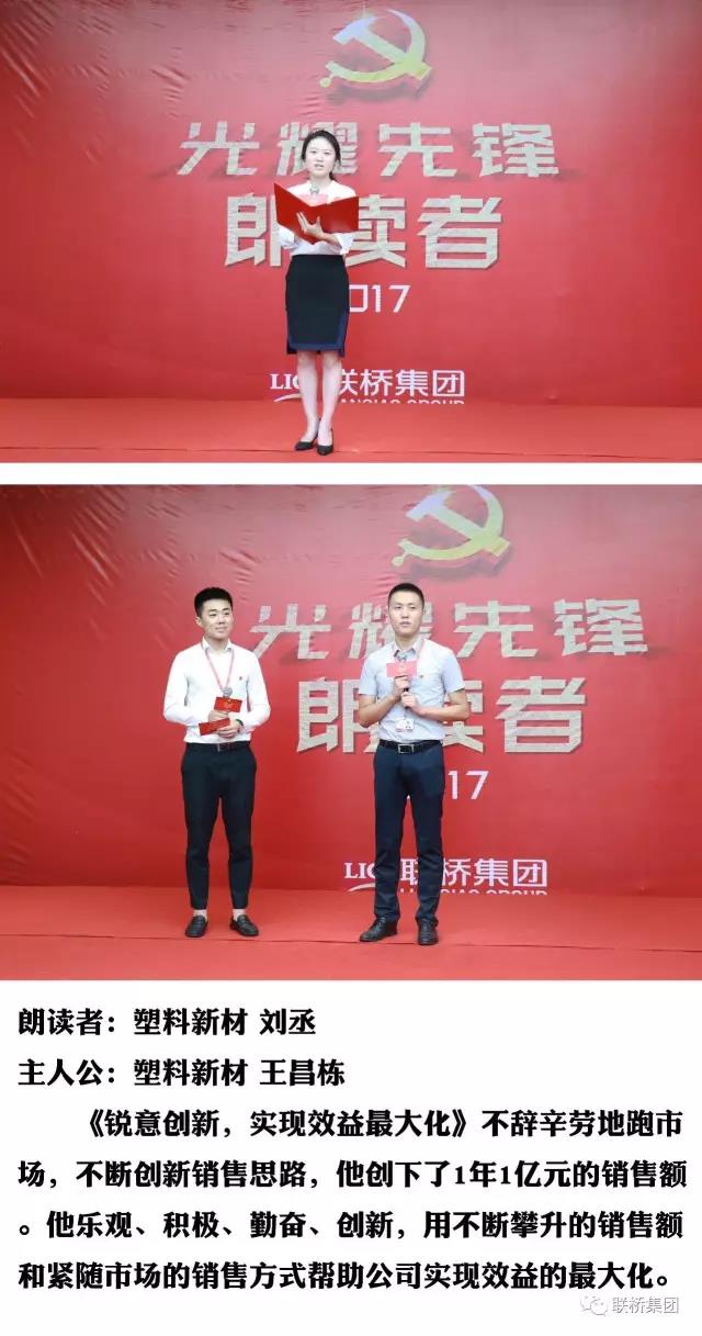 2017年7月26日下午,聯(lián)橋集團黨委舉辦了“光耀先鋒朗讀者”活動,150名黨員齊聚一堂,用《朗讀者》的節(jié)目形式,講述聯(lián)橋光耀先鋒優(yōu)秀黨員的感人故事。集團黨委書記、董事長慕镕鍵,集團董事、塑料新材黨支部書記慕衛(wèi)波,集團黨委副書記宋威麗等領導出席了活動。