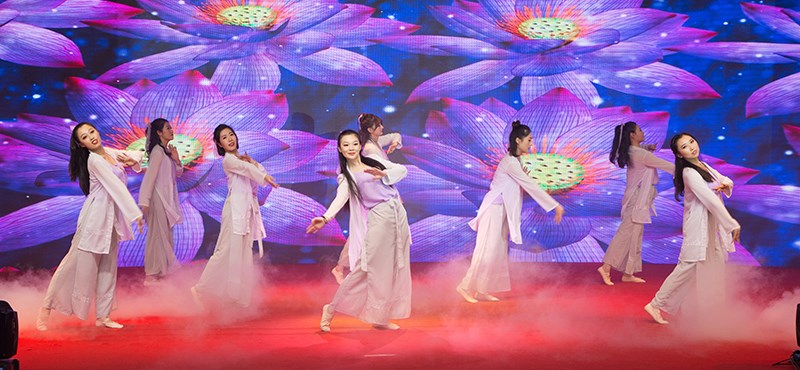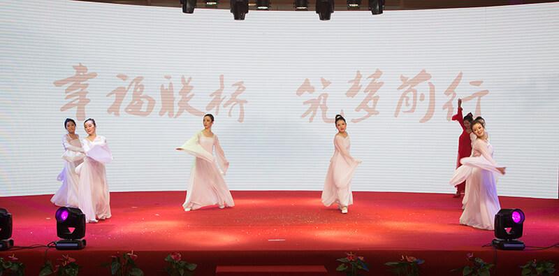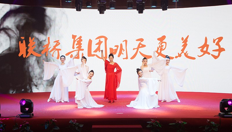 總部的古典舞《采薇》大有漢唐樂舞“翹袖折腰”的舞姿形象,古典韻味十足又有聯(lián)橋賦予的時代新創(chuàng)意;紡織服裝行業(yè)的墨舞《筑夢聯(lián)橋》也是如此,把舞、樂、書、畫熔于一爐,在情景交融、人屏互動中,“幸福聯(lián)橋 筑夢前行”八個大字躍然眼前,當(dāng)“聯(lián)橋集團(tuán)明天更美好”出現(xiàn)在屏幕上時,現(xiàn)場掌聲雷動。